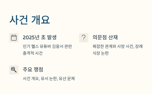 2025년 초, 인기 헬스 유튜버이자 사업가였던 김웅서와 관련된 충격적인 사건이 알려지면서 모두를 놀라게 했어요. 김웅서 기지현 사이에 벌어진 복잡한 관계와 사망 사건, 그리고 장례식장의 의문점들이 차례로 드러나면서 논란은 커졌죠. 이번 글에서는 김웅서 기지현 사건을 둘러싼 1. 사건 개요와 의문점 2. 김웅서 유서 및 장례식 논란 3. 남겨진 가족과 유산 문제를 중심으로 자세히 살펴볼게요.