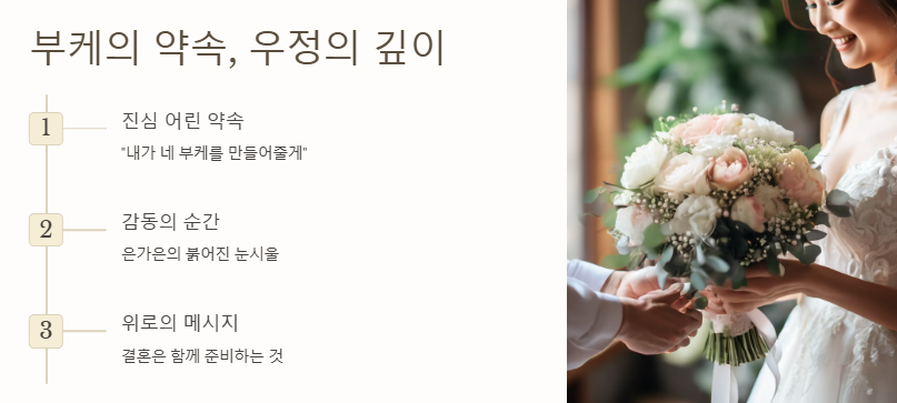 결혼은 끝이 아니라 새로운 시작이다. 이다해는 이를 누구보다 잘 알고 있었고, 은가은은 그것을 이제 배워가는 중이다. 이다해가 “부케는 내가 만들어 줄게”라고 말한 순간, 은가은은 자신이 혼자가 아님을 깨달았다. 함께 울고 웃고 공감해주는 사람이 있다는 것만으로도 결혼을 준비하는 하루가 조금은 덜 무겁게 느껴졌을 것이다.