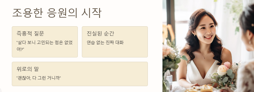 브라이덜 샤워 도중, 이다해는 조용히 물었다. “살다 보니 고민되는 점은 없었어?” 그 질문은 어떤 연습도 없는 즉흥적인 대화였지만, 오히려 그래서 진짜였다. 은가은은 긴 침묵 끝에 고개를 끄덕였다. 이다해는 미소를 지으며 “괜찮아, 다 그런 거니까. 나도 그랬어”라고 말했다. 이 짧은 문장은 결혼을 준비하는 예비 신부들의 마음을 어루만지기에 충분했다.