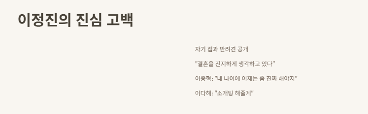 방송 후반부에 이정진이 자기 집을 공개했는데, 반려견이랑 같이 사는 모습이 너무 평온하고 힐링이더라고요. 거기서도 또 “결혼을 진지하게 생각하고 있다”고 말했는데, 그 말 듣고 나 완전 심쿵했잖아요. 방송이라서 대충 던진 말이 아니라는 게 딱 느껴졌거든요. 그 표정이랑 톤에서 진심이 느껴졌어요. 게다가 이종혁이 “네 나이에 이제는 좀 진짜 해야지” 이런 식으로 장난치니까, 이정진도 웃으면서 고개 끄덕이더라고요. 완전 현실 친구들끼리 대화하는 느낌. 그리고 다음 장면에서 이다해가 또 다시 “소개팅 해줄게”라고 하니까, 그 흐름이 진짜 자연스럽고 설레는 포인트였어요.
