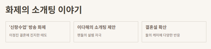 예전에는 연예인 소개팅 하면 다 꾸며진 상황 같았는데, 이건 진짜 친구끼리 자연스럽게 주고받는 대화 같아서 신선했어요. 그리고 이다해도 그냥 예능 캐릭터처럼 행동하는 게 아니라, 진짜로 “이 사람한테 어울리는 사람을 소개해주고 싶다”는 마음이 느껴졌어요. 요즘 연예계도 소개팅 주선자 역할로 연결된 커플 많잖아요. 그래서 팬들 입장에선 ‘이번에도?’ 싶은 기대가 생기는 것 같아요. 게다가 이다해 이정진 키워드가 계속 뜨는 것도, 사람들이 진짜 궁금해한다는 증거죠. 저도 검색해서 영상 다 보고 기사도 찾아봤어요.