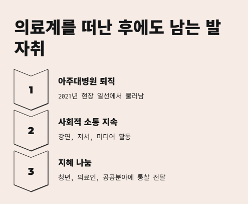 그는 이후 강연, 저서, 미디어 활동 등을 통해 사회적 소통을 지속하며, 의료계 밖에서도 계속해서 공익을 위한 행보를 이어가고 있다. 최근에는 방송 및 칼럼 기고를 통해 청년 세대, 의료인들, 공공 분야 종사자들에게 통찰과 지혜를 나누고 있다.
