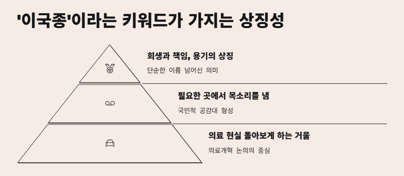 ‘이국종’이라는 이름이 이렇게 오랫동안 회자되는 이유는 단지 뛰어난 수술 실력 때문이 아니다. 그보다도, 그는 한국 의료시스템의 구조적 문제를 공개적으로 지적한 소신 있는 의사였기 때문이다. “사람 살리는 데 돈을 따지는 나라”라는 그의 발언은 국민의 마음을 울렸다.