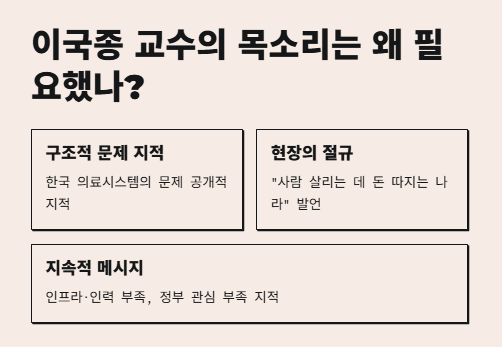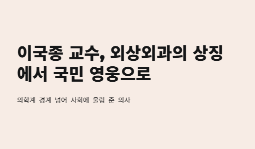 이국종 교수님은 지금도 말보단 행동으로 증명하는 사람입니다. 다만, 우리 사회가 그의 외침에 좀 더 귀 기울였으면 해요. “왜 그렇게까지 말해야 했을까?”가 아니라, “우린 그동안 뭘 못 들었을까?”를 돌아보는 계기가 되었으면 좋겠어요.