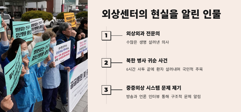 그는 또한 방송 프로그램 ‘유 퀴즈 온 더 블럭’과 뉴스 인터뷰를 통해 지속적으로 메시지를 전했다. 중증외상센터에 필요한 인프라와 인력 지원이 부족하다는 현실, 정부의 관심 부족, 의료진의 소모적인 노동환경 등 날카로운 비판은 단순한 푸념이 아닌, 현장의 절규였다.