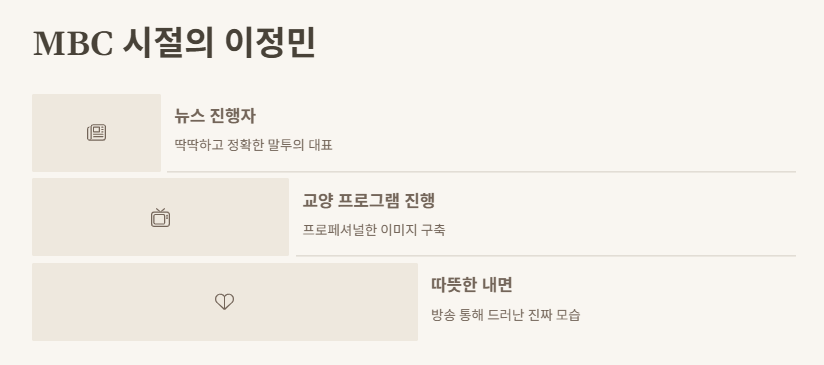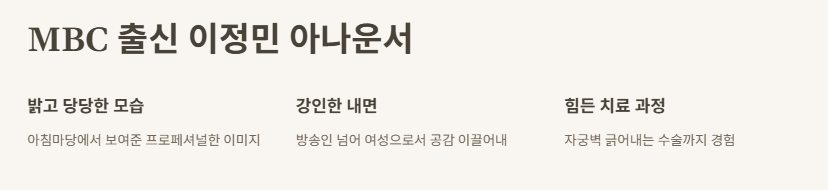 예전에 뉴스나 교양 프로그램에서 봤던 이정민 아나운서 이미지는 딱딱하고 정확한 말투의 대표였거든. 근데 이렇게 따뜻하고 깊은 마음을 가진 사람이라는 걸 이번에 처음 알았어. 겉으론 강해 보여도 그 속엔 얼마나 많은 눈물이 있었을까 싶어.