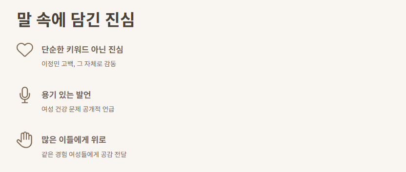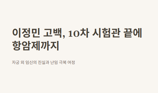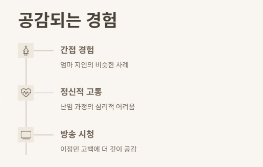그녀의 말 한마디 한마디가 진심이었고, 그 안에 수많은 여성들이 겪고 있는 현실적인 문제가 녹아 있었어. 난임, 유산, 자궁 외 임신, 항암치료까지... 단어 하나하나가 무겁고 어렵지만, 이정민 고백을 통해서 이 주제가 더 이상 숨겨지지 않게 된 것 같아.