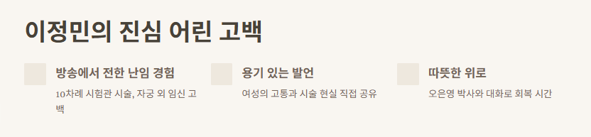 방송 보면서 놀란 건 이정민 씨 남편 박치열 님 얘기였어. “일 때문에 병원에 함께 못 갔던 게 너무 미안하다”말하더라고. 이정민 고백도 감동이었지만, 남편의 고백도 묵직했어. 서로가 아픈 시간을 이해하고, 다시 손 잡는 모습에 진심 울컥했어.