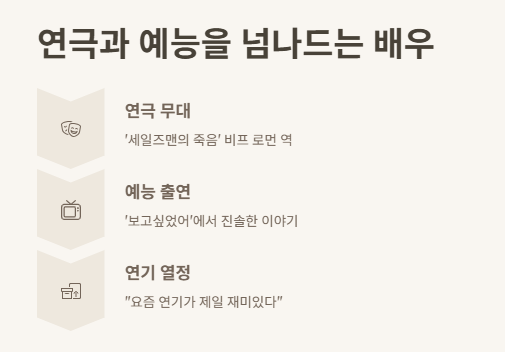 연극 '세일즈맨의 죽음'에서 주연을 맡았으며, 예능 '보고싶었어'에 출연 중입니다.