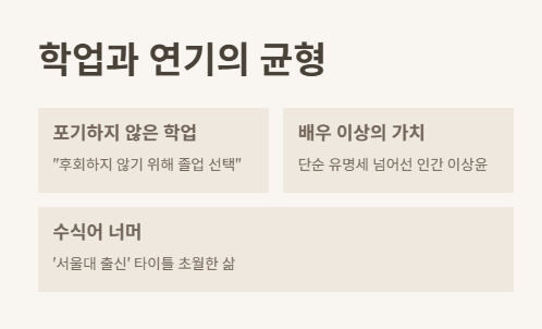 이상윤은 방송에서 “학업을 포기하려 했지만, 결국 졸업을 선택한 건 후회하지 않기 위해서”라고 말했습니다. 이는 단순히 유명세나 연기력뿐 아니라 인간 이상윤의 철학을 드러내는 부분입니다. ‘서울대 출신 연예인’이라는 타이틀은 그를 따라다니는 수식어지만, 그는 그 이상의 삶을 보여주고 있는 중입니다.