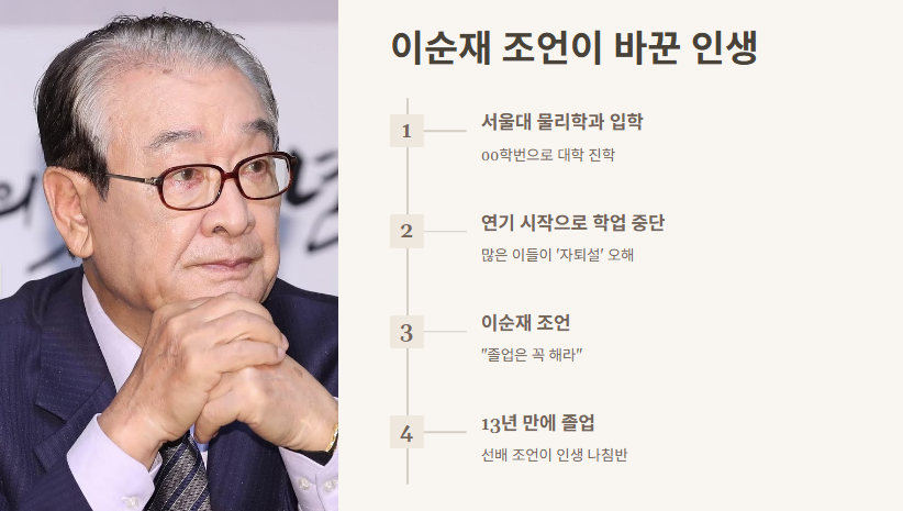 연기 활동으로 학업을 미루다 선배 이순재의 조언을 듣고 졸업을 결심하게 되었습니다.