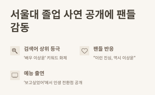 사실 이상윤 배우가 서울대 출신이라는 건 예전부터 알고 있었어요. 물리학과라는 말에 “진짜 공부를 잘했구나” 싶었죠. 하지만 그가 그 긴 시간 동안 학업을 미뤘다가, 연기와 병행하며 결국 졸업장을 손에 쥐었다는 사실은 이번에 방송을 통해 처음 알게 되었어요.