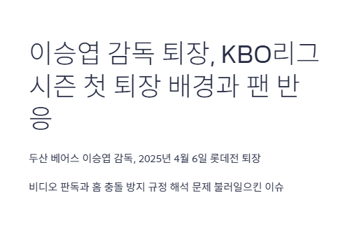 두산 베어스 이승엽 감독이 2025년 4월 6일, 부산 사직구장에서 열린 롯데 자이언츠와의 경기 중 퇴장을 당하며 KBO리그 시즌 첫 퇴장 감독이 되었습니다. 이번 이승엽 감독 퇴장은 단순한 퇴장을 넘어, 비디오 판독과 홈 충돌 방지 규정 해석 문제까지 불러일으킨 이슈였습니다. 경기 도중 포수 김기연의 홈 베이스 수비 과정에서 벌어진 상황이 퇴장의 발단이 되었습니다.