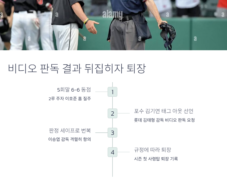 문제가 된 장면은 5회말 6-6 동점 상황. 전준우의 안타로 2루 주자 이호준이 홈을 향해 질주했고, 두산 포수 김기연은 송구를 받아 태그 후 아웃을 선언받았습니다. 하지만 롯데 김태형 감독은 포수가 홈을 막았다고 주장하며 비디오 판독을 요청했고, 판정은 세이프로 번복되었습니다.
