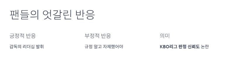 일각에서는 이승엽 감독의 항의를 '감독의 리더십'으로 받아들이고 있으나, 다른 한편에선 "규정을 알고 있었다면 자제했어야 했다"는 지적도 나옵니다. 하지만 이 사건이 의미심장한 이유는 단순한 퇴장이 아닌, KBO리그 판정 신뢰도에 대한 논란이 이어졌기 때문입니다.