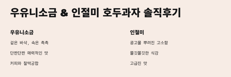 일단 우유니소금 호두과자는 한 입 베어 물면 겉은 바삭, 속은 촉촉~ 우유앙금이 부드럽게 퍼지는데, 소금이 단짠단짠해서 진짜 매력적이에요. 커피랑 같이 먹으면 완전 찰떡궁합! 공부하다가 한두 개 먹으면 피로가 확 풀릴 느낌이에요.