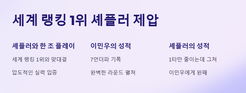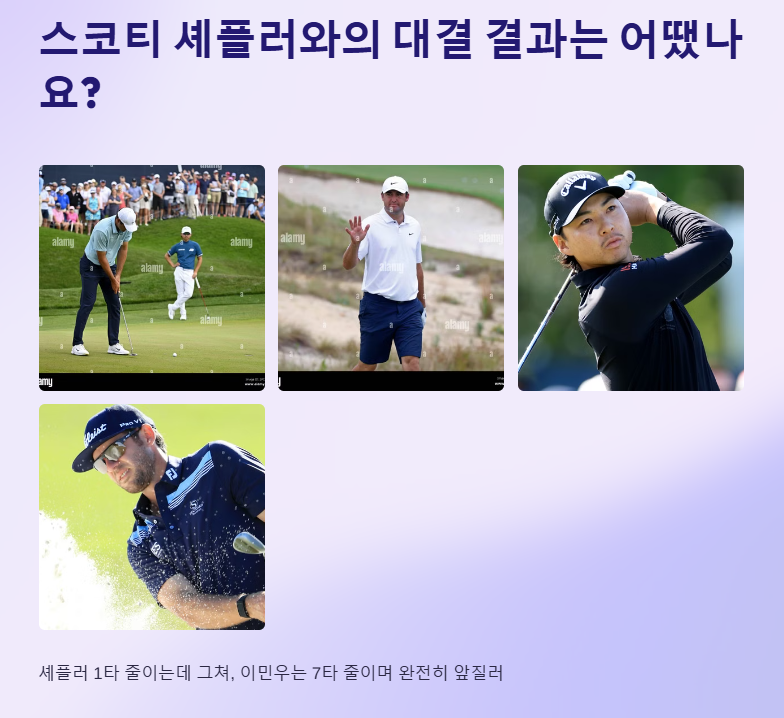 3라운드에서 세계 랭킹 1위 스코티 셰플러와 한 조로 플레이하며 이민우는 압도적인 실력을 보여줬다. 셰플러는 1타를 줄이는데 그쳤지만, 이민우는 완벽에 가까운 라운드를 펼쳤다.
