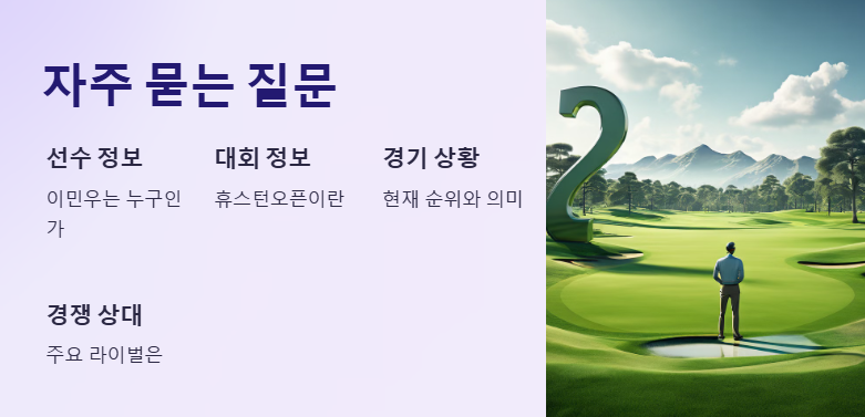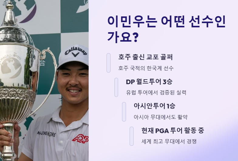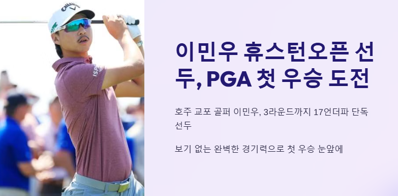 호주 교포 골퍼 이민우가 2025년 PGA 투어 텍사스 칠드런스 휴스턴 오픈에서 3라운드까지 단독 선두에 올라 첫 우승을 눈앞에 두고 있다. 이민우는 보기 없이 7언더파를 기록하며 3일간 17언더파 193타의 성적으로 리더보드 최상단을 장식했다.