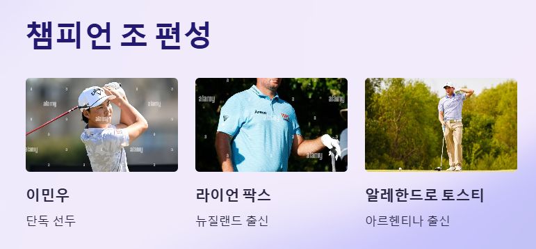 최종 라운드에서 이민우는 라이언 팍스, 토스티와 챔피언 조로 경기를 진행할 예정이다. 라이언 팍스와는 DP 월드투어에서 함께했던 사이로, 호흡 맞추기에 유리한 구성이 될 전망이다.