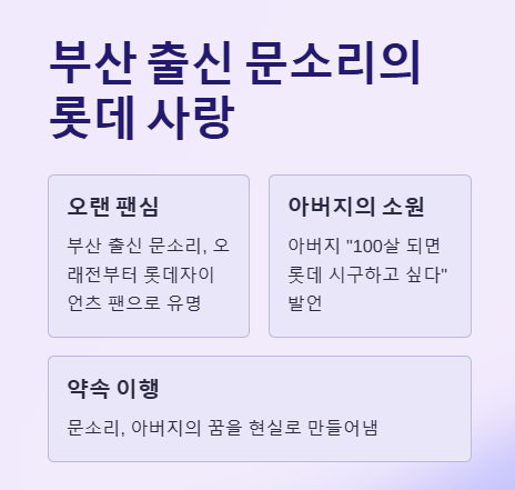 부산 출신인 문소리는 오래전부터 롯데자이언츠 팬으로 유명했습니다. 그녀의 아버지는 방송에서 “100살이 되면 롯데 시구를 하고 싶다”고 밝히며 많은 이들의 마음을 울렸습니다. 그 말이 현실이 되었고, 문소리는 그 약속을 지켜냈습니다.