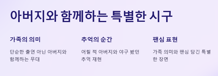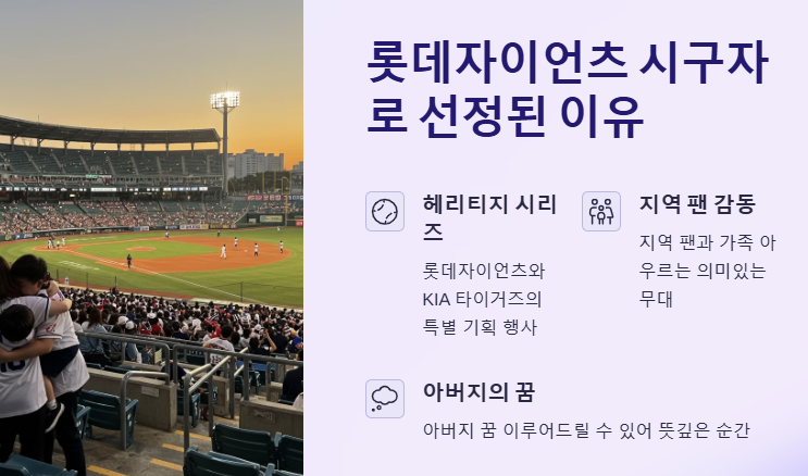 이번 이벤트는 롯데자이언츠와 KIA 타이거즈의 ‘헤리티지 시리즈-미니 영호대제전’ 중 하나로 기획된 행사입니다. 단순한 시구가 아닌, 지역 팬과 가족을 아우르는 감동의 무대죠. 특히, 배우 문소리는 “아버지의 꿈을 이루어드릴 수 있어 뜻깊다”고 소감을 밝혔습니다.