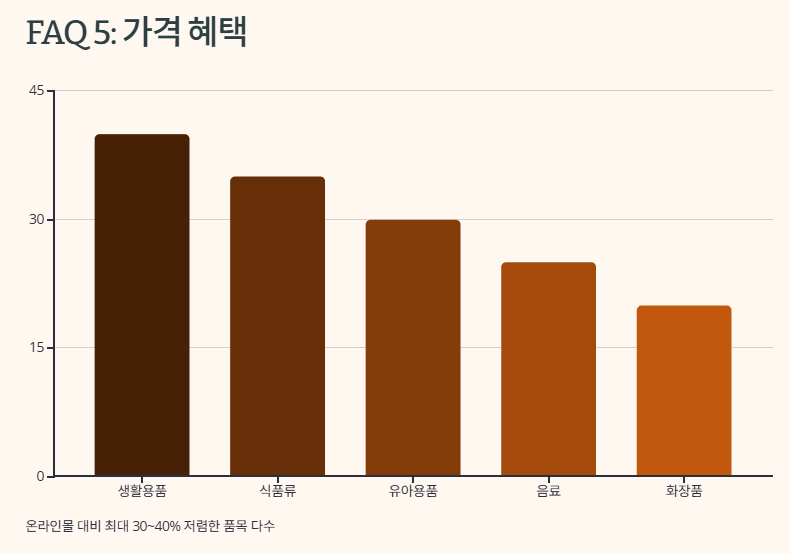 상품에 따라 다르지만, 온라인몰 대비 최대 30~40% 저렴한 품목도 있습니다.