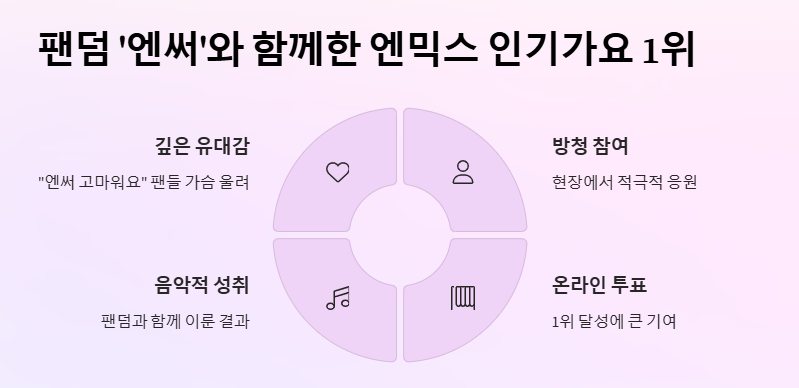NMIXX의 이번 1위는 단순히 음악적 성취뿐 아니라 팬덤 ‘엔써’와의 깊은 유대감을 다시 한 번 드러낸 순간이다. 수상 직후 “엔써 고마워요”라는 말은 팬들 가슴을 울렸다. 실제로 팬들은 인기가요 방청과 온라인 투표에서 적극적으로 참여해 1위 달성에 큰 기여를 했다.