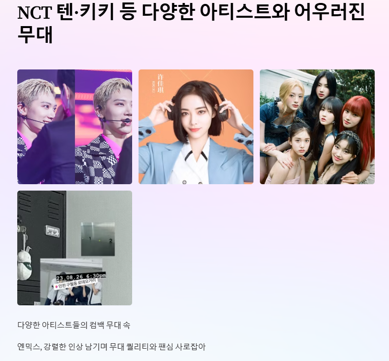 NCT 텐, 키키, 스테이씨, 뉴비트, TNX 등 다양한 아티스트들이 출연했습니다.