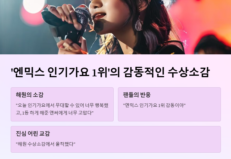이 장면을 지켜보던 많은 팬들은 SNS에 "엔믹스 인기가요 1위 감동이야", "해원 수상소감에서 울컥했다"며 진심 어린 반응을 남겼다.