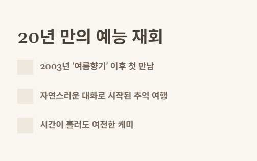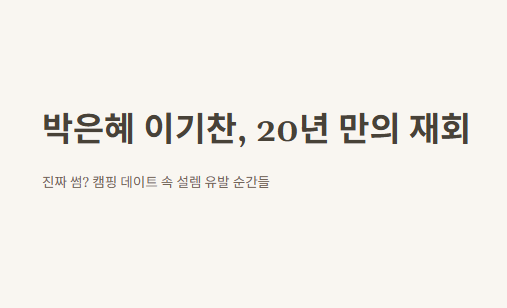 배우 박은혜와 가수 이기찬이 KBS ‘오래된 만남 추구 시즌2’에서 20년 만에 다시 만나 설렘을 안겼다. 이들의 자연스러운 대화와 캠핑 속 플러팅 장면은 시청자들의 추억과 궁금증을 자극하며, 2003년 ‘여름향기’ 이후 시간이 흘러도 여전한 케미를 보여줬다.