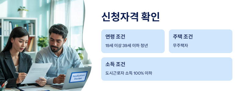 무주택자여야 하고, 도시근로자 소득 100% 이하여야 돼요.
