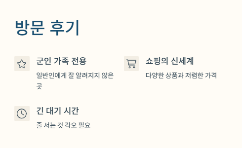 - 식품/냉동식품: 햇반, 과자, 라면, 냉장햄 등 군마트 특유의 저렴한 가격!