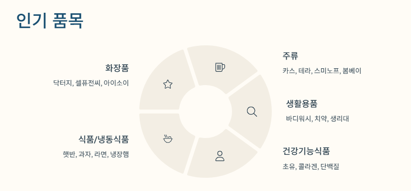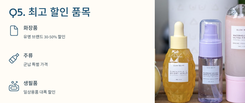 - 주류, 화장품, 생활용품 가격 시중 대비 30~50% 저렴