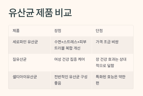| 세로파민 유산균 | 수면+스트레스+피부 트러블 복합 개선 | 가격 조금 비쌈 |