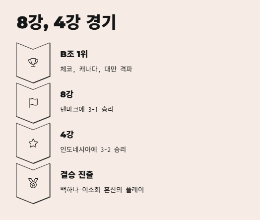그리고 8강에서는 덴마크, 4강에서는 인도네시아랑 붙어서 각각 3-1, 3-2로 이겼지. 진짜 손에 땀을 쥐게 하는 경기였어. 특히 인도네시아전은 여자복식 마지막 세트까지 가는 진짜 극적인 경기였는데, 백하나-이소희 조가 완전 혼신의 플레이 보여줬어!