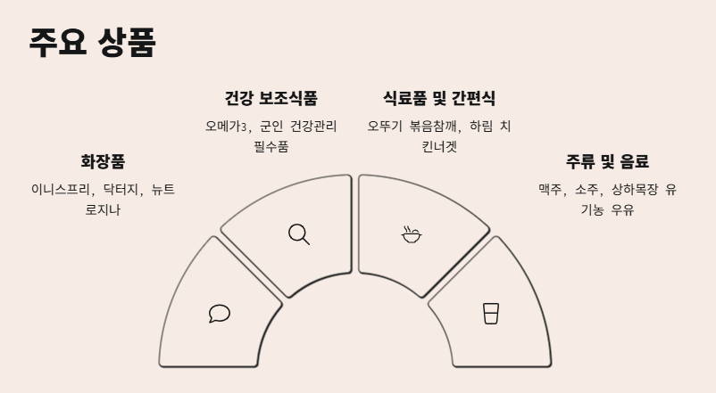 오메가3와 같은 건강 보조식품이 인기 있으며, 군인들의 건강 관리에 필수적인 제품들이 다양하게 마련되어 있습니다. - 식료품 및 간편식