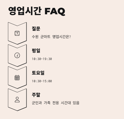 A1. 수원 군마트는 평일에는 10:30-19:30, 토요일은 10:30-15:00까지 운영되며, 주말에는 군인과 그 가족만 이용 가능한 시간대가 존재합니다.
