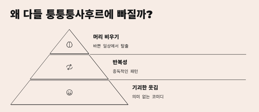 이유는 단순해요. "의미 없음 + 반복성 + 기괴한 웃김" 이 삼박자가 완벽. 요즘 바쁜 일상에 머리를 비우고 싶을 때, 아무 의미 없는 퉁퉁퉁사후르 영상이 최고거든요.