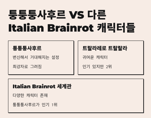 퉁퉁퉁사후르는 Italian Brainrot 세계관에서도 최강자로 그려져요. "트랄라레로 트랄랄라" 같은 다른 캐릭터도 귀엽지만, 아무래도 퉁퉁퉁사후르가 변신해서 거대해지는 설정 때문에 인기가 폭발하는 듯.