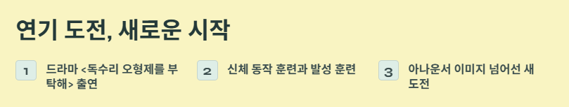 방송에서 연기 수업을 받는 과정도 공개되면서 “아나운서가 이렇게 열정적으로 연기를 준비할 수 있구나”라는 반응이 이어졌습니다. 연기에 대한 욕심을 보여주는 동시에, 자기 발전을 위해 끊임없이 노력하는 모습이 시청자들에게 긍정적으로 다가오고 있습니다.