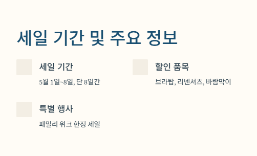 : 5월 1일부터 8일까지 단 8일간 진행되는 패밀리 위크 한정 세일. - 에어리즘·브라탑 할인 상품 분석