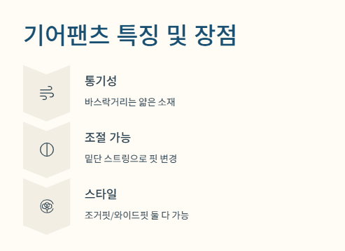 기어팬츠도 입어봤는데, 와… 여름에도 시원하게 입을 수 있는 바지라서 이건 꼭 사야 해요. 바스락거리는 얇은 소재라 통기성 좋고, 밑단 스트링 조절로 조거핏 / 와이드핏 둘 다 가능해요!