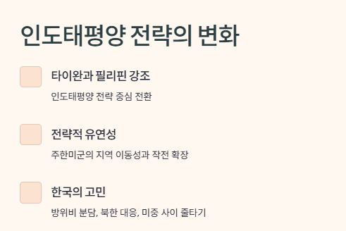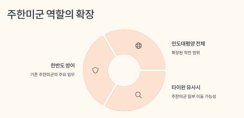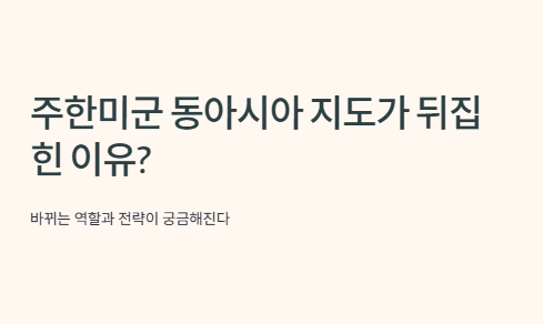 “주한미군 동아시아 지도가 거꾸로 바뀐 이유는 무엇일까?”에 대한 답은 점점 명확해지는 듯했어. 이건 미국이 한반도 중심의 방어 개념에서 벗어나서, 인도태평양 전체를 아우르려는 전략의 시각적 표현이었던 거야.