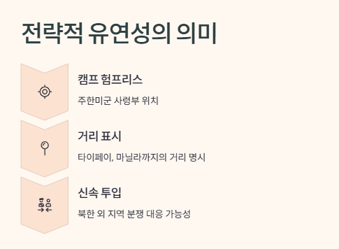 이걸 전략적 유연성(Strategic Flexibility)라고 하더라. 솔직히 처음엔 뭐 그리 중요한 말이겠어 싶었는데, 이게 진짜 크고 무거운 이야기였어. 주한미군 사령관인 브런슨 장군도 “이 지도를 보면 왜 전략적 유연성이 필요한지 명확하다”고 했대.