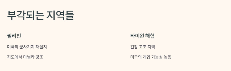 그리고 타이완 해협은 요즘 뉴스만 틀면 나오는 지역이잖아. 거기서 무슨 일이 생기면 미국은 당연히 움직일 준비를 할 거고, 그러면 주한미군도 거기 포함되는 거지. 완전 실전 이야기가 되어가는 거라서 좀 소름돋았어.