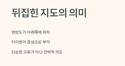 얼마 전에 우연히 친구 오빠가 미군 관련 공부하면서 보여준 사진이 있었는데, 한반도가 아래쪽에 있고, 타이완이 중심처럼 나온 거야. 그래서 “이거 지도 잘못 만든 거 아냐?” 했더니 그게 바로 ‘주한미군 동아시아 전략 지도’래! 이게 단순한 오류가 아니라, 일부러 ‘뒤집어서’ 만든 전략 지도였다는 거 알게 됐어.