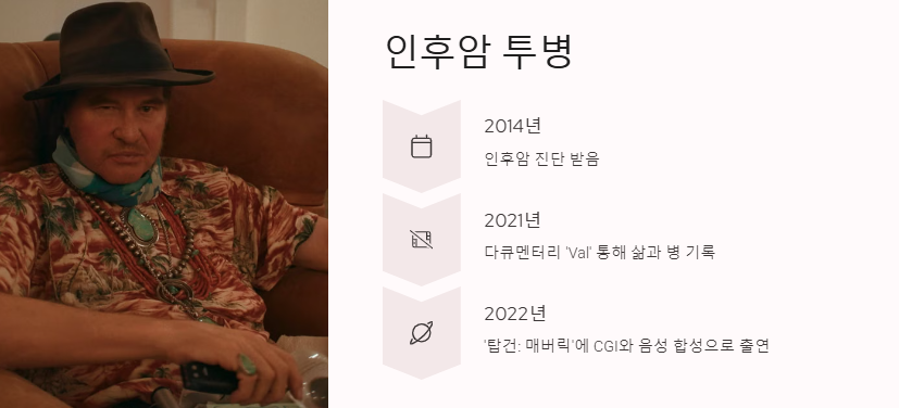 그의 사망은 단순한 질병으로 인한 것이 아니다. 발 킬머는 2014년 인후암 진단을 받고 오랜 기간 투병 생활을 이어왔다. 말하기조차 어려운 상태에서도 그는 2021년 다큐멘터리 ‘Val’을 통해 자신의 삶과 병을 담담하게 기록했다. 이 작품은 칸 영화제에서 공개되어 많은 이들에게 감동을 주었다.