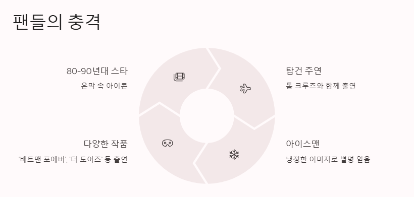 할리우드 스타 발 킬머가 사망했다는 사실은 영화 팬들에게 적지 않은 충격이었다. 1980년대와 90년대를 수놓은 스타였던 그는 은막 속 아이콘이었다. 킬머는 1986년 영화 ‘탑건’에서 톰 크루즈와 함께 주연을 맡았으며, 특유의 냉정한 이미지로 ‘아이스맨’이라는 별명까지 얻었다.