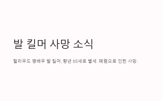 발 킬머는 폐렴으로 인해 사망했습니다. 생전 인후암 투병을 겪은 바 있습니다.