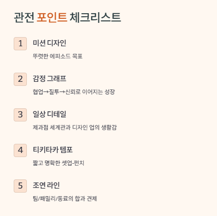 첫째, 미션 디자인: 에피소드 목표가 매번 뚜렷하면 체류시간이 늘어남. 둘째, 협업→질투→신뢰로 이어지는 감정 그래프: ‘관계가 성장하고 있다’는 신호를 장면 곳곳에 심을수록 러브라인 설득력 업. 셋째, 일상 디테일: 제과점 세계관(빵수저, 후계자 업무)과 디자인 업(유메리의 생계형 디자이너 텍스처)로 생활감이 살아야 진짜 설렌다. 넷째, 티키타카 템포: 셋업-펀치가 짧고 명확해야 밈/짤로 터진다. 다섯째, 조연 라인: 팀/패밀리/동료가 주는 합과 견제가 케미 배가 장치.